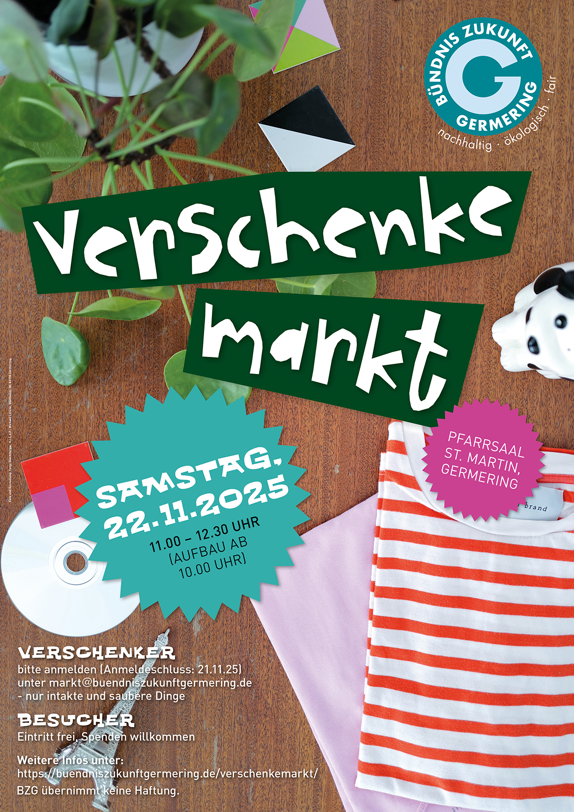 Menschen, die gut erhaltende, funktionstüchtige Dinge übrig haben und teilnehmen möchten, melden sich bei BZG bis 21.11.2025 an und reservieren einen Tisch via E-Mail markt@buendniszukunftgermering.de.